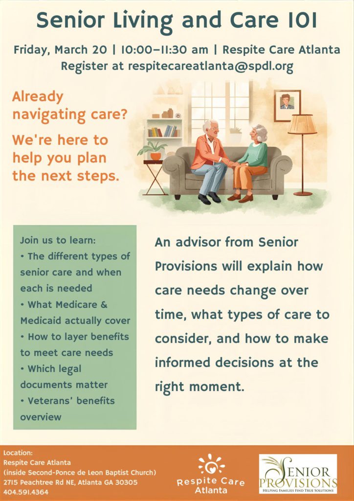 - This informative session will help you better understand the different types of senior care, how care needs change over time, and what to consider when making future decisions. You’ll also learn what Medicare and Medicaid actually cover, how to layer benefits, which legal documents are most important, and what veteran benefits may apply. Whether you’re thinking ahead for yourself or want to be more prepared for the future, this workshop offers clear, practical guidance.